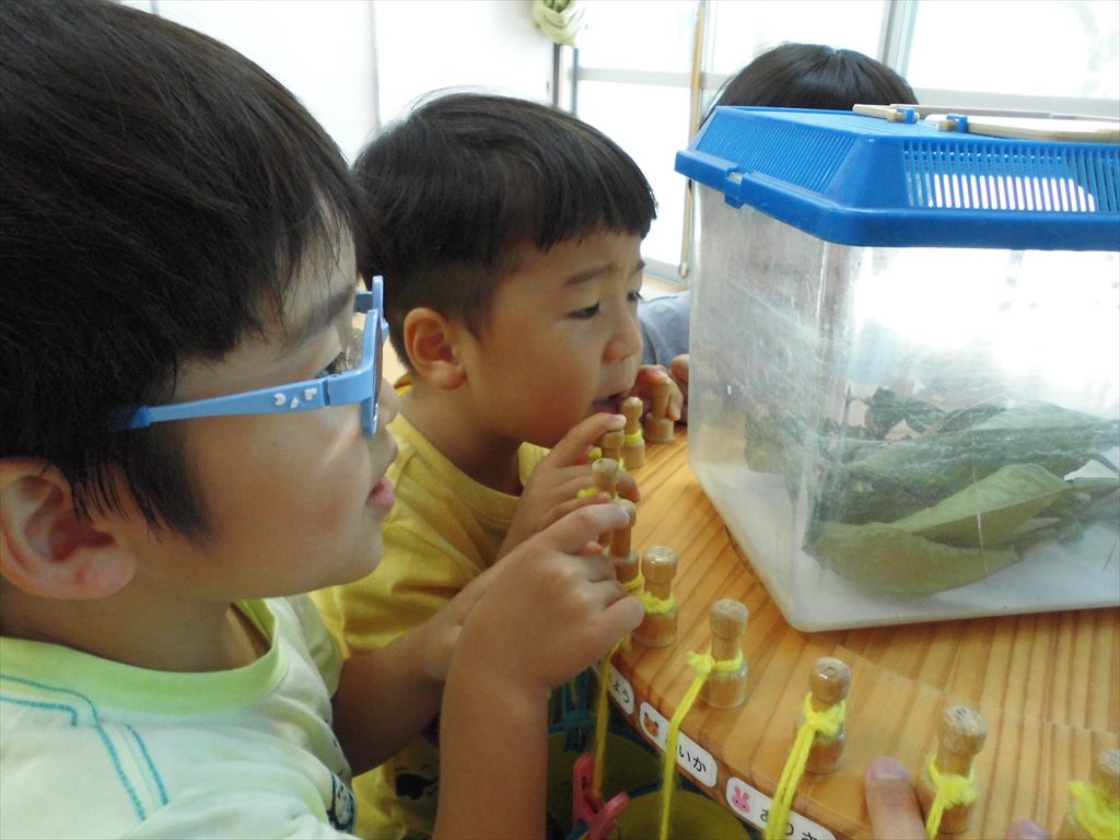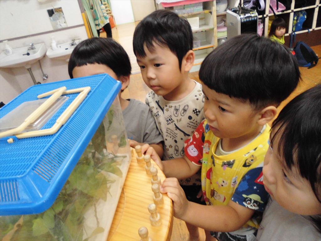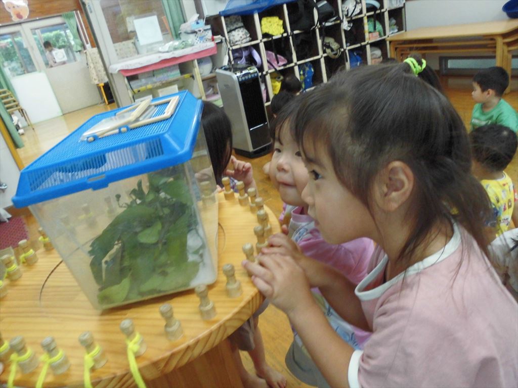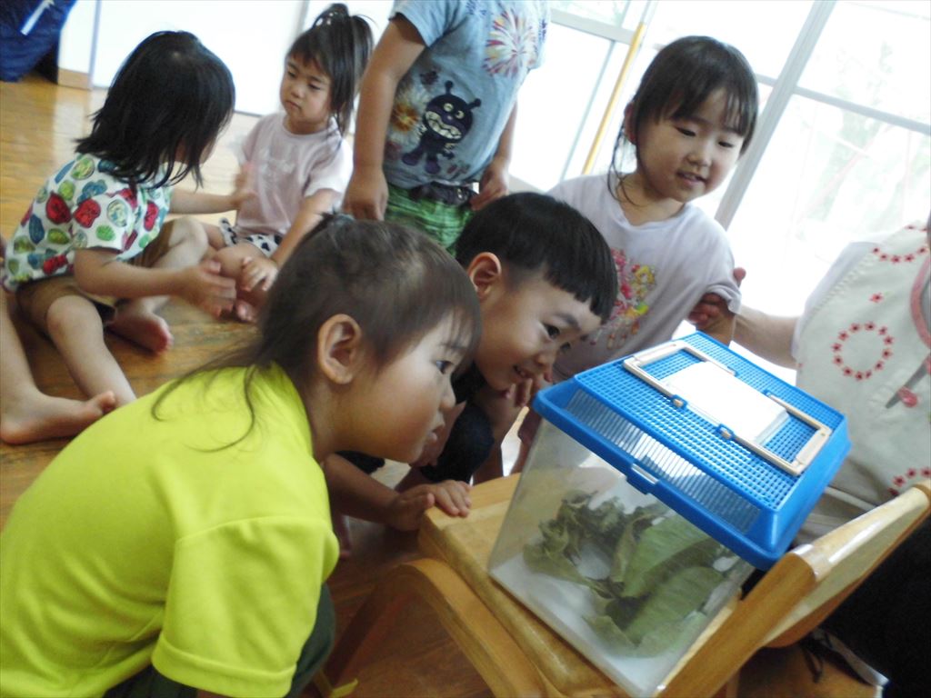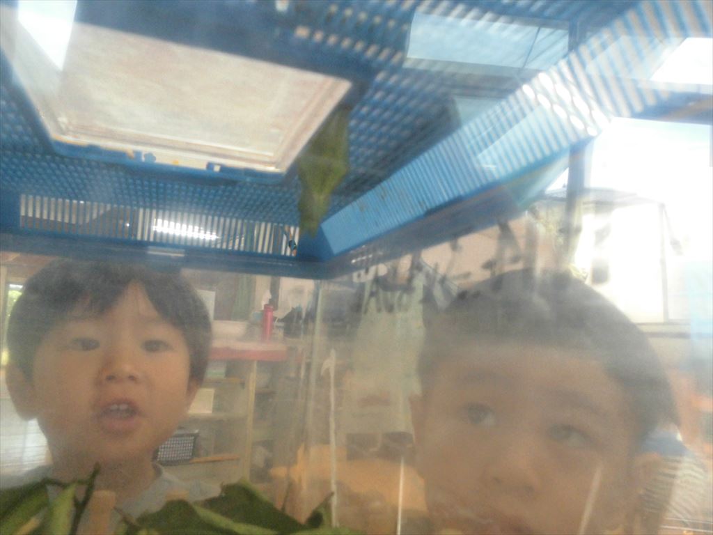 おいしそうに葉を食べるあおむしを興味津々にみていた子供たちです。